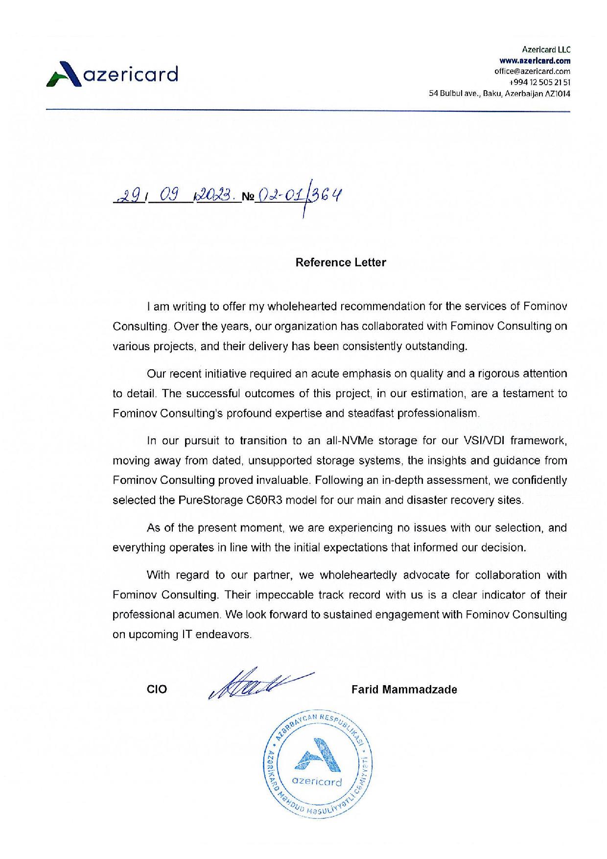 I would like to take this opportunity to recommend Fominov Consulting IT company, which completed a three months long consulting and technical IT audit project (March-June 2017) at International Bank of Azerbaijan. We found Fominov Consulting as a very professional company whose proposals and recommendations would certainly boost our internal IT processes and save the significant resources. Having dedicated several months to the thorough analysis of our local IT industry, Fominov Consulting Company demonstrated their best technical practices, as well as proposed organizational changes and new infrastructure development strategies.