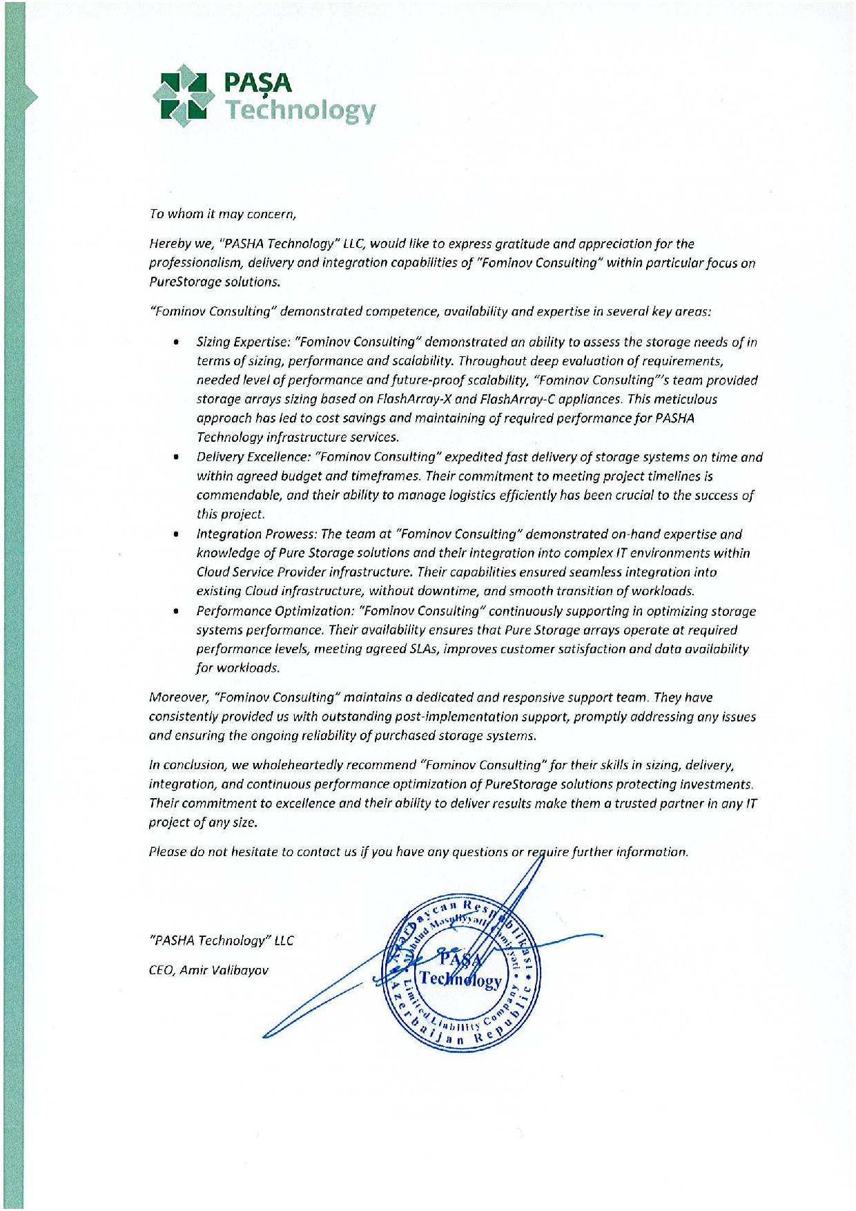 Hereby we, “PASHA Technology LLC, would like to express gratitude and appreciation for the professionalism, delivery and integration capabilities of “Fominov Consulting” within particular focus on PureStorage solutions.