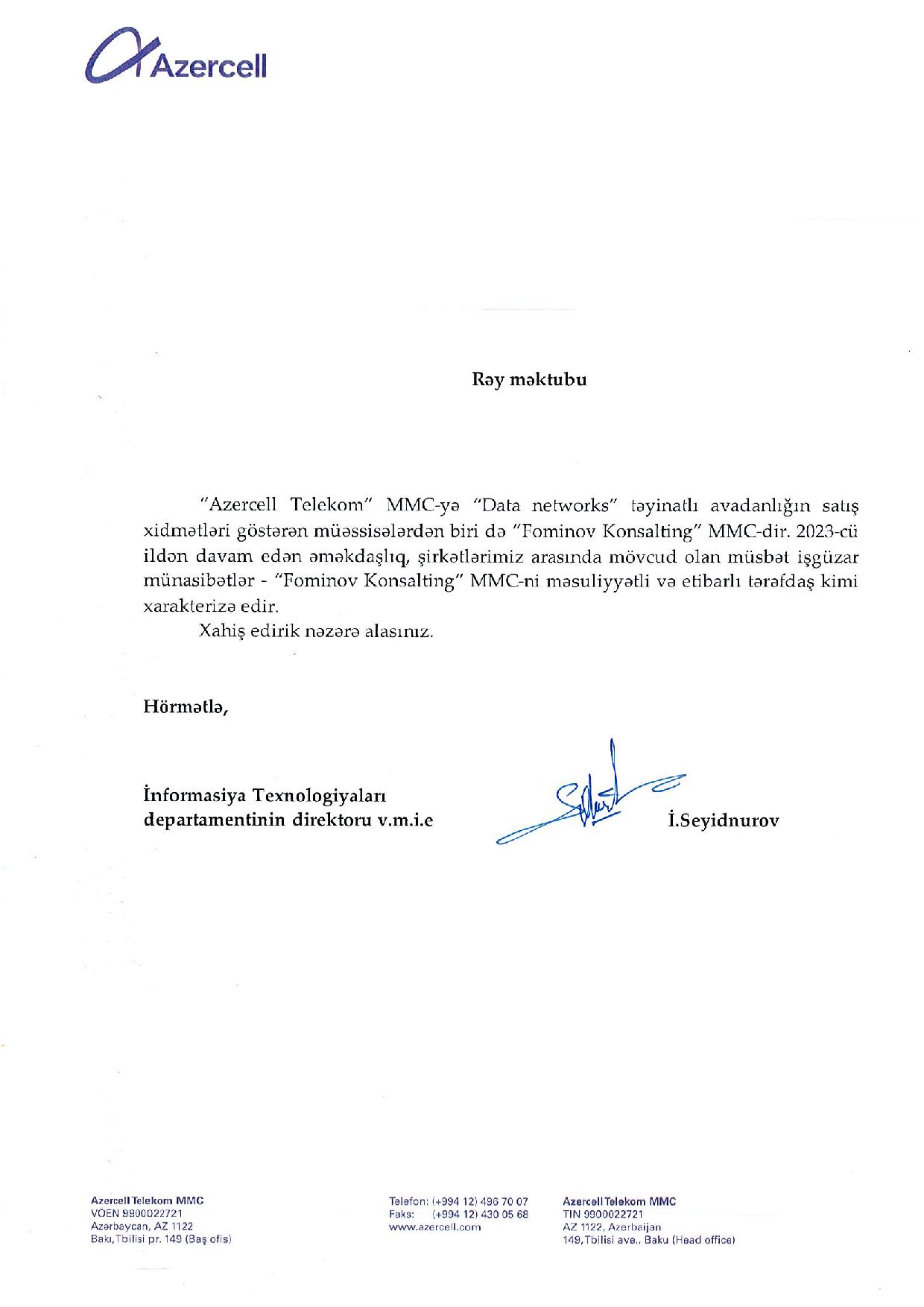 “Azercell Telekom” MMC-yə “Data networks” təyinatlı avadanlığın satış xidmətləri göstərən müəssisələrdən biri də “Fominov Konsalting” MMC-dir. 2023-cü ildən davam edən əməkdaşlıq, şirkətlərimiz arasında mövcud olan müsbət işgüzar münasibətlər – “Fominov Konsalting” MMC-ni məsuliyyətli və etibarlı tərəfdaş kimi xarakterizə edir.