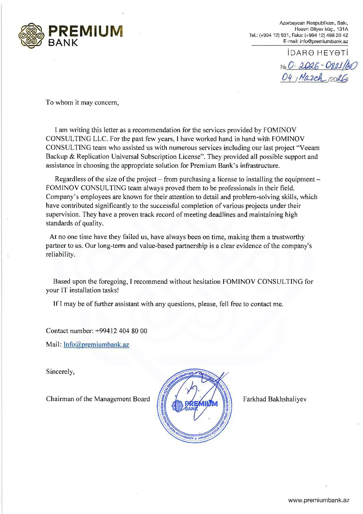 I am writing this letter as a recommendation for the services provided by FOMINOV CONSULTING LLC. For the past few years, I have worked hand in hand with FOMINOV CONSULTING team who assisted us with numerous services including our last project “Veeam Backup & Replication Universal Subscription License”. They provided all possible support and assistance in choosing the appropriate solution for Premium Bank’s infrastructure.